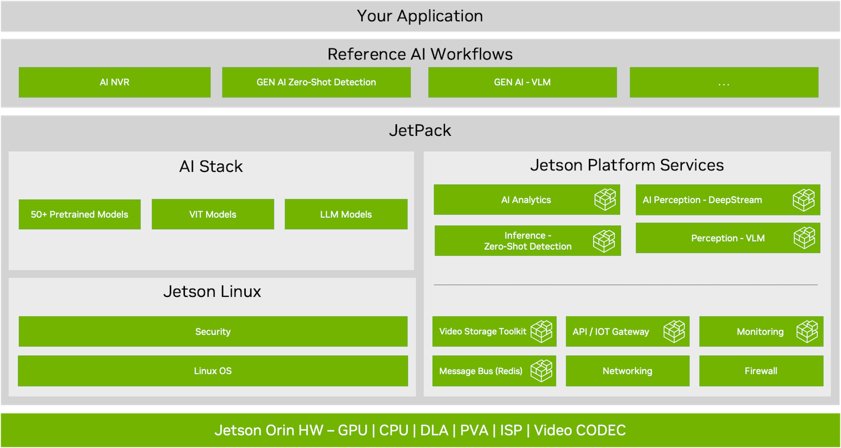 • Pre-install NVIDIA® JetPack 6.0+ SDK, including the complete development environment of CUDA, cuDNN, TensorRT, DeepStream, etc. For system features, see Jetpack SDK 6.0. For system programming tutorials, please refer to the「System Programming Guide」.