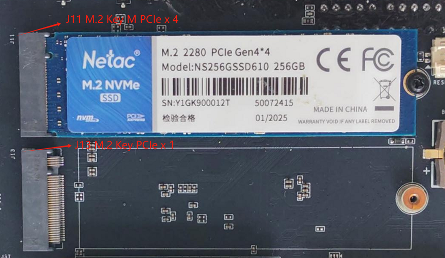 - Mount the SSD in the M.2 Key M PCIex4 interface of J11 (recommended), or the M.2 Key M PCIex1 interface of J13;