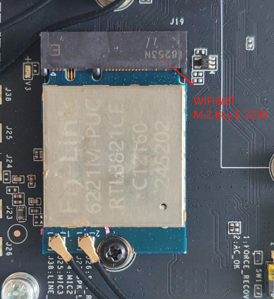 - Mount the Wi-Fi & BT module to the M.2 Key E 2230 of J19 and connect it to the external antenna (Optional);