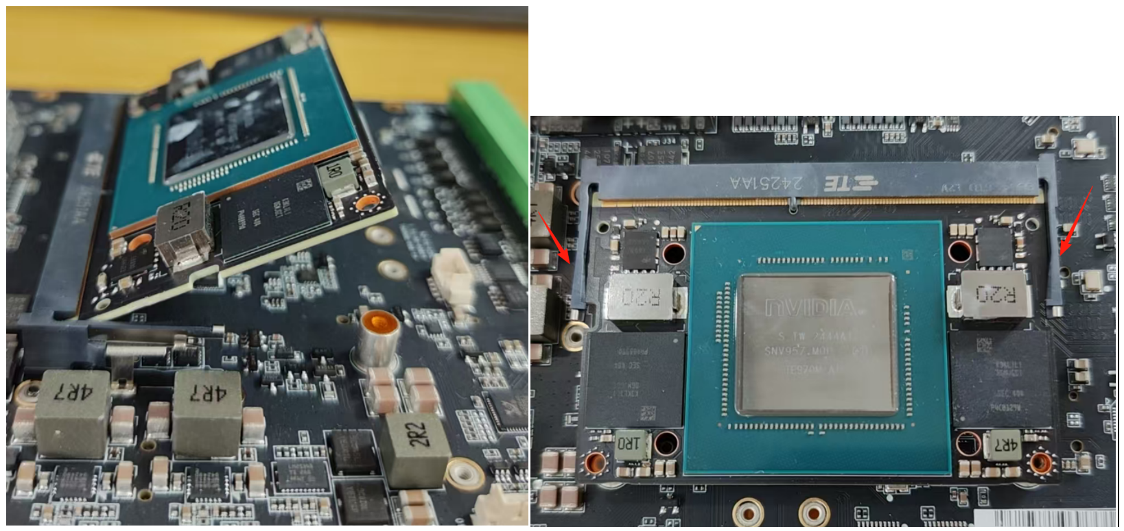 - Installing the core module, first insert the gold finger end into the J1 slot at a 45° angle. Then, press the module downward by hand until the metal locks on both sides automatically engage to ensure secure installation. To remove the module, release the metal locks on both sides first, and then pull the module out.